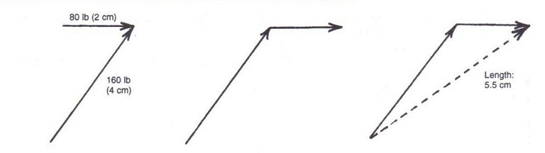 Since 1 cm = 40 lb, and the net arrow = 5.5 cm, then the net force = 220 lb