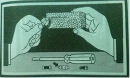 تناول هذا المصباح من طرفه المعدنى ثم ادعك الطرف الآخر بواسطة قطعة من البوليستر مادة من الألياف الصناعية ذات التجويفات يمكن الحصول عليها بإقتطاعها من ساند الأدوات الكهربية داخل علب التغليف وبواسطة الدعك يبدأ المصباح فى الإضاءة الخافتة التى يمكن تمييزها بسهولة عند إجراء التجربة فى حجرة مظلمة. من المعلوم أن البوليسترين مادة لينة حتى أن الكريات الصغيرة للمادة تتصل بعضها البعض وتشحن كهربيا .. وتتجمع الألكترونات على السطح وبعدها تنتقل بواسطة المصباح الصغير إلى جسد القائم بالتجربة, وبهذه الطريقة يضاء المصباح سبق لليونانيين القدماء اكتشاف أنه بدعك الكهرمان الأصفر فإنه يكتسب صفة جذب الأجسام الأخرى, وأطلقوا اسم الألكترون على هذه الراتنجينات المتحجرة الصلبة.